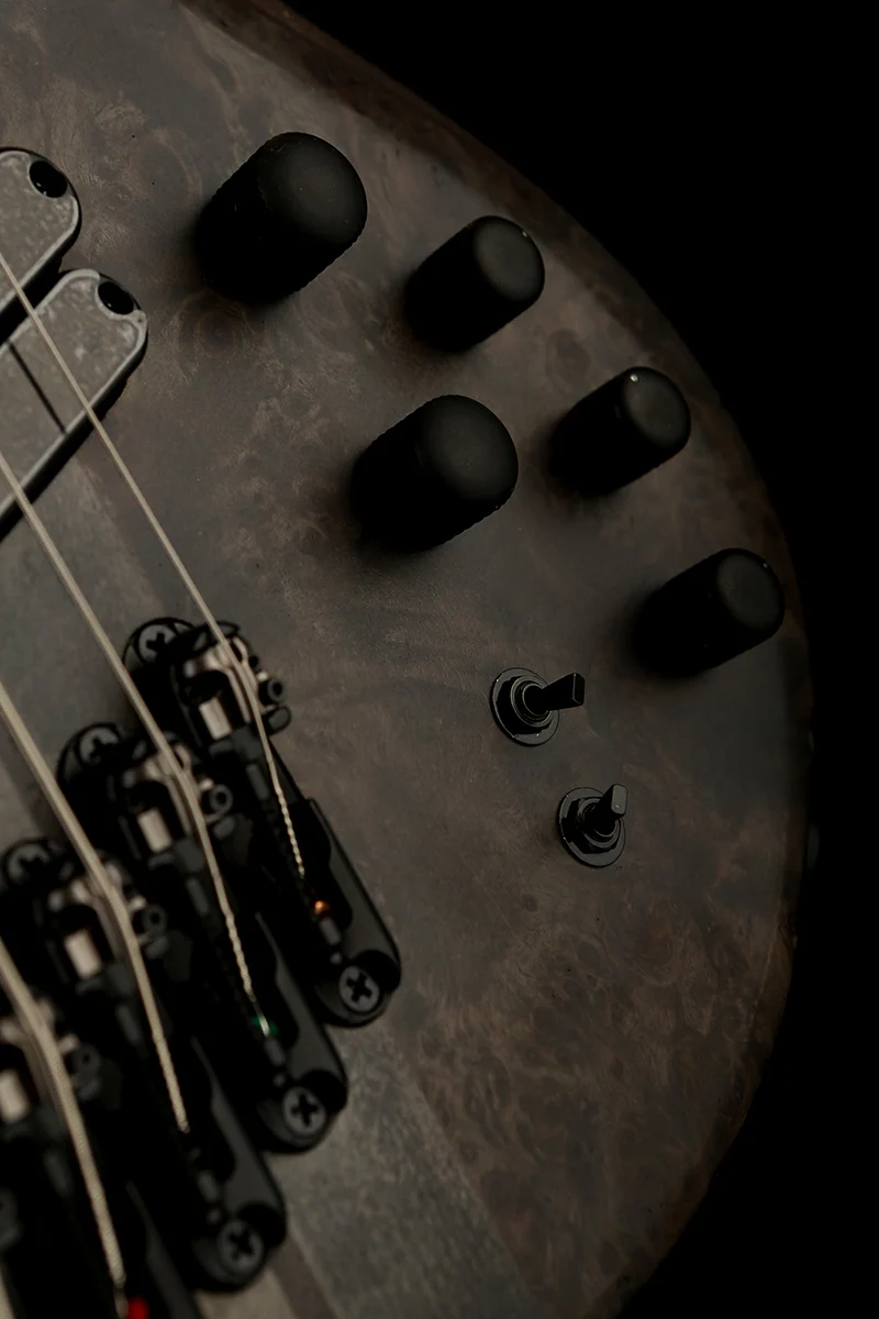 The bass features a 5pc Maple/Walnut neck through construction with Graphite reinforcement rods and a Panga Panga fretboard with durable Stainless Steel frets.