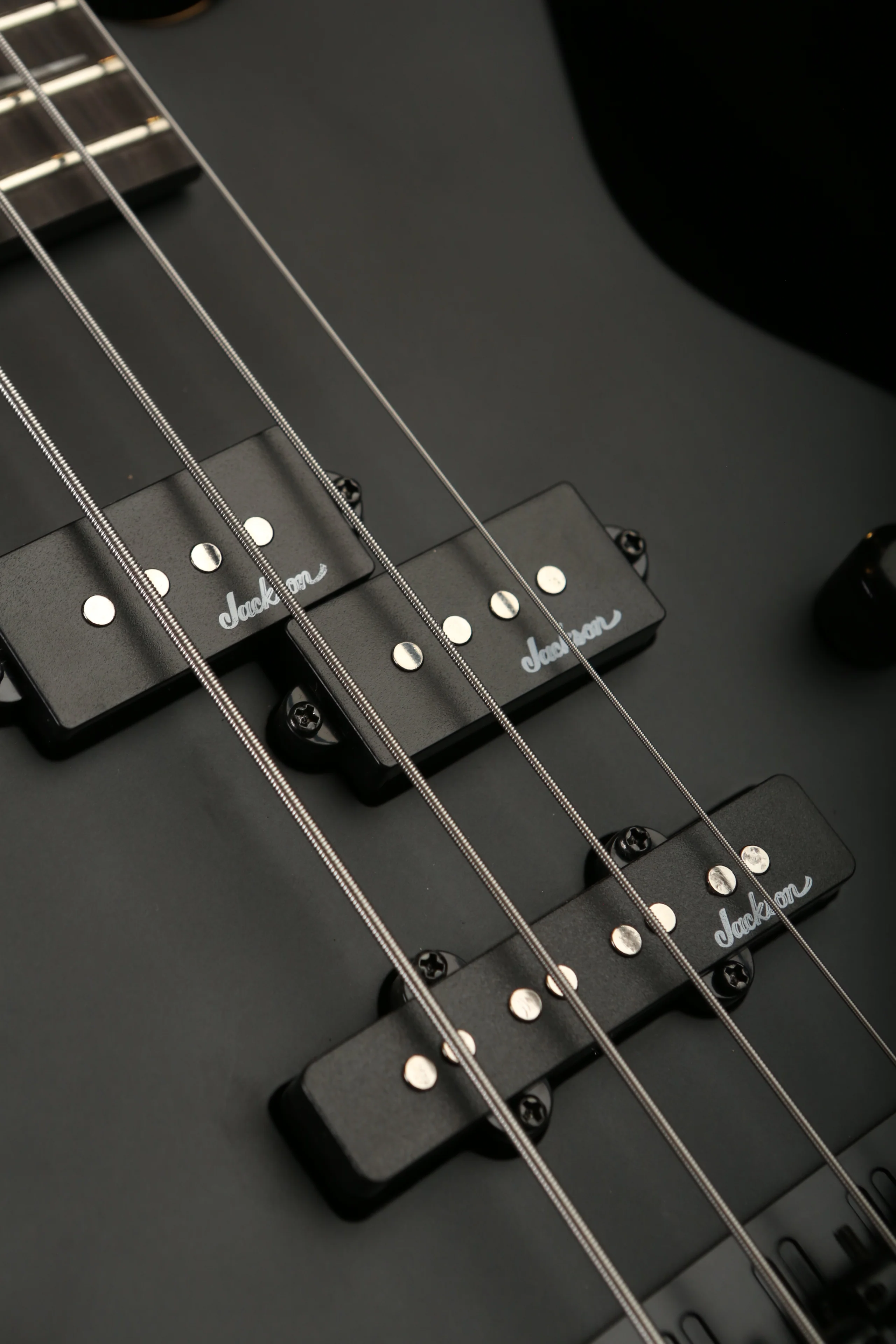 A Jackson P style neck pickup and Jackson J style bridge pickup power this 4-string bass, which also features a pair of volume knobs, single tone knob, hardtail bridge with black base plate and Jackson-branded tuners.